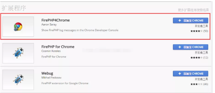 在Chrome浏览器的应用商店中,搜索firephp关键词,在出来的插件列表中,选择第一个,将它添加到Chrome即可